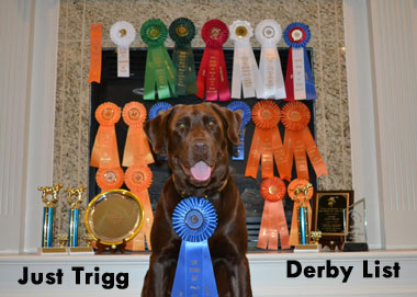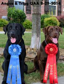When we saw that Maggie's litter had been bred we had a feeling that this was the Chocolate Labrador that we had been searching for every since Jake had passed away. Jake was a once in a lifetime Chocolate Lab and we did not think that we would ever be so fortunate to ever own another like him. Within a couple of weeks of picking Maggie up on Christmas Day 2007 we knew that she was a very special girl. She has done nearly everything right from the first day. We had to wait until the spring thaw to do her first water retrieves. The first two bumpers were thrown at the edge of the water to get her feet wet. The third was thrown about 6 feet from shore and Maggie leaped completely past it . She came to the surface turned around and retrieved it to hand. The picture above was taken on her first day of water work. The pictures below were taken on her second day ever of being in the water. Maggie has incredible drive to go with her complete set of natural skills yet has been a dream to handle. Maggie's only limitations are our ability to train/handle her. She is a litter mate of FC-AFC-CFC-CAFC-NDD Upon the Wings of an Answered Prayer(Ammo). Ammo just won the High Point Derby Dog of the Year award and shattered the all time points record for Derby dogs. Maggie is out of GMPR Santa Fe's Contender Tyra MH and sired by AFC/QAA Wing Magic's Louisiana Roux MH. Maggie's litter mate GMPR Roux's Diamond in the Rough QAA'd in the summer of 2010. Due to financial/job issues in 2009 we had to suspend competing dogs. We plan to resume competing in the spring of 2013 when the test/trials resume in the Midwest. Maggie is OFA Hips/GOOD and Elbows/NORMAL. She is clear for CNM and her eye CERF is normal. She is a carrier of the EIC gene and when bred the stud will be EIC Clear and the litter will be micro chipped and EIC tested. Maggie is a litter mate to the most titled Chocolate Lab(Ammo) in history and puts her stuff in her puppies. One puppy from her first litter, Just Trigg(owned by Monte Bochart) made the Derby field trial list in 2012. Big Gun Angus(Monte Bochart) from Maggie's second litter placed 4th and 1st in 3 Derbies so far in 2013. Angus finished his derby career in 2014 when he turned 2 years old. He ran in 14 stakes and placed in 12 of them and finishing on the Derby list. Her third litter went home in the summer of 2013 and from the early reports we expect even better results from that litter. Our pup from that litter CC got her first AKC Senior Hunter pass at 14 months. He litter mate naz is about to start running Derby. On Aug. 29, 2014 Big Gun Angus and Just Trigg placed 1 & 2 in a Qual making both QAA giving Maggie two QAA puppies from her first two litters. Angus was 2 years 5 months old when he QAA'd. Maggie's puppies continue to prove the bloodline passes it's traits on. Maggie will be bred again in late winter/early spring 2015 likely to FC Nandool's Elwood Blues for an all chocolate litter. Multiple deposits already. Her puppies can hunt or compete at any level with any Labs in the country on land or in the water. They also point upland birds. This is the best Chocolate Labrador bloodline in the world currently and most likely in history. Maggie's litters sell out before they are whelped so please do not delay in placing deposits on her litters. We prefer these pups go to competitive homes but may make a few exceptions.