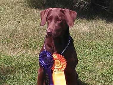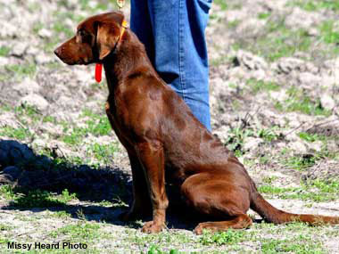 Stella was sired by MPR RattlinRidge's Bronco Bill MH(Willie). Willie is tractable,has a lot of drive and desire to retrieve. He is also a stylish upland bird hunter, with natural point. He is extremely intelligent and biddable. He is dark brown and a muscular 70-75 pounds with a good nose. Willie has jammed Derby's and Quals. SCL's Sugar Magnolia is Stella's dam and she has a lot of Maggie in her. Maggie is a litter mate of FC-AFC-CFC-NCAFC-NDD Upon the Wings of an Answered Prayer(Ammo) who was the 2009 High Point Derby dog that shattered the all time points record by 40%. Ammo now holds 3 of the all time field trial records. Stella has drive and style with a very aggressive water entry. She is fast, powerful, and intelligent. Stella has a great on/off switch and is very good around children and in the house. At nine months she was marking 200+yards to perfection. Stella achieved her AKC Senior Hunter(SH) title in 2013 after taking a year off due to a migrating weed seed in her bloodstream that was finally resolved. Stella will run APLA and HRC events to get her GMPR and HRCH titles. Her early training was done by Dan and Missy Heard of Downtown Retrievers. After a year off due to the migrating weed seed issue she earned her AKC SH title with Rusty Haglund of Trigger Time Kennels. Mike Lettau of K&L Kennels will work with her for her GMPR title. Several of Stella's litter mates will also compete in HRC, AKC, and APLA tests. Three earned AKC JH titles and one an AKC SH and jammed a Derby in 2011 and made the Derby list in 2012 and earned QAA honors in 2014 with a rookie handler/owner. Two hunted pheasants in South Dakota at 5 months of age and were stars among veteran adult pro trained Labs. Owners of these pups purchased 3 puppies from Maggie's next litter(3-25-2012) as did the breeder of the 2011 NFC, FC NFC Watermark's Running Back and the reports thus far are excellent on them. One of them placed 4th in it's first Derby in June of 2013. Stella has a great disposition and loves to work. She also pointed the first bird planted for her. On her first day of water retrieves at 3 months she was leaping 10 feet into the water fearlessly like her mother Maggie. Stella may already be our best dog. Stella is EIC/CNM Clear. Her hips/elbows are certified OFA Good/Normal. She began her heat cycle a couple of days after the OFA X-rays were taken so she may be OFA Excellent. Her CERF is current. She carries only chocolate genes(bbEE). CNM and EIC Clear. The sky is the limit for Stella.