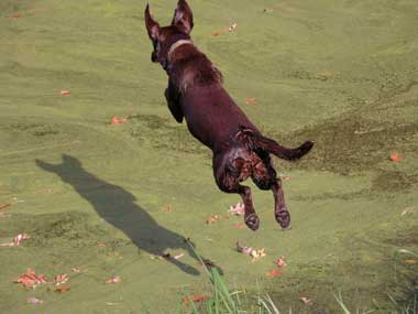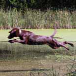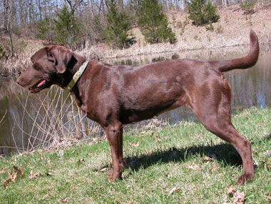 When we saw that Maggie's litter had been bred we had a feeling that this was the Chocolate Labrador that we had been searching for every since Jake had passed away. Jake was a once in a lifetime Chocolate Lab and we did not think that we would ever be so fortunate to ever own another like him. Within a couple of weeks of picking Maggie up on Christmas Day 2007 we knew that she was a very special girl. She has done nearly everything right from the first day. We had to wait until the spring thaw to do her first water retrieves. The first two bumpers were thrown at the edge of the water to get her feet wet. The third was thrown about 6 feet from shore and Maggie leaped completely past it . She came to the surface turned around and retrieved it to hand. The picture above was taken on her first day of water work. The pictures below were taken on her second day ever of being in the water. Maggie has incredible drive to go with her complete set of natural skills yet has been a dream to handle. Maggie's only limitations are our ability to train/handle her. She is a litter mate of FC-AFC-CFC-CAFC-NDD Upon the Wings of an Answered Prayer(Ammo). Ammo just won the High Point Derby Dog of the Year award and shattered the all time points record for Derby dogs. Maggie is out of GMPR Santa Fe's Contender Tyra MH and sired by AFC/QAA Wing Magic's Louisiana Roux MH. Maggie's litter mate GMPR Roux's Diamond in the Rough QAA'd in the summer of 2010. Due to financial/job issues in 2009 we had to suspend competing dogs. We plan to resume competing in the spring of 2013 when the test/trials resume in the Midwest. Maggie is OFA Hips/GOOD and Elbows/NORMAL. She is clear for CNM and her eye CERF is normal. She is a carrier of the EIC gene and when bred the stud will be EIC Clear and the litter will be micro chipped and EIC tested. Maggie is a litter mate to the most titled Chocolate Lab(Ammo) in history and puts her stuff in her puppies. One puppy from her first litter, Just Trigg(owned by Monte Bochart) made the Derby field trial list in 2012. Big Gun Angus(Monte Bochart) from Maggie's second litter placed 4th and 1st in 3 Derbies so far in 2013. Angus finished his derby career in 2014 when he turned 2 years old. He ran in 14 stakes and placed in 12 of them and finishing on the Derby list. Her third litter went home in the summer of 2013 and from the early reports we expect even better results from that litter. Our pup from that litter CC got her first AKC Senior Hunter pass at 14 months. He litter mate naz is about to start running Derby. On Aug. 29, 2014 Big Gun Angus and Just Trigg placed 1 & 2 in a Qual making both QAA giving Maggie two QAA puppies from her first two litters. Angus was 2 years 5 months old when he QAA'd. Maggie's puppies continue to prove the bloodline passes it's traits on. Maggie will be bred again in late winter/early spring 2015 likely to FC Nandool's Elwood Blues for an all chocolate litter. Multiple deposits already. Her puppies can hunt or compete at any level with any Labs in the country on land or in the water. They also point upland birds. This is the best Chocolate Labrador bloodline in the world currently and most likely in history. Maggie's litters sell out before they are whelped so please do not delay in placing deposits on her litters. We prefer these pups go to competitive homes but may make a few exceptions.
